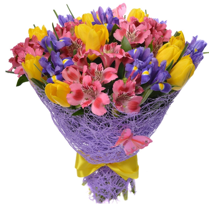 Букет состоит из 11 тюльпанов, 11 ирисов, 7 альстромерий, красивая упаковка, атласная лента.