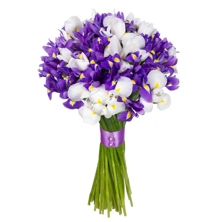 Букет состоит из 30 синих ирисов, 21 белый ирис, синяя или сиреневая лента.