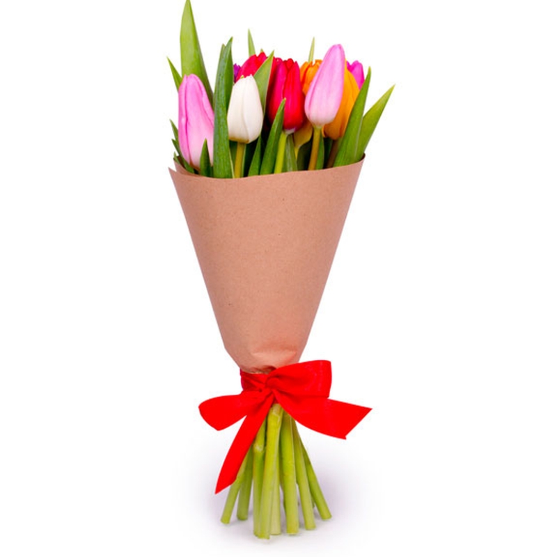 Букет состоит из 9 разноцветных тюльпанов, крафт, атласная лента.
