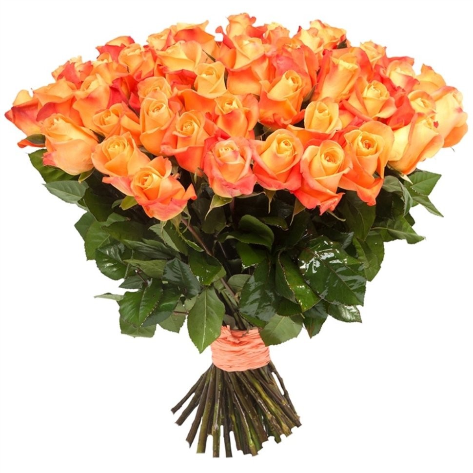 Букет состоит из 55 оранжевых роз, прозрачная упаковка, атласная лента.