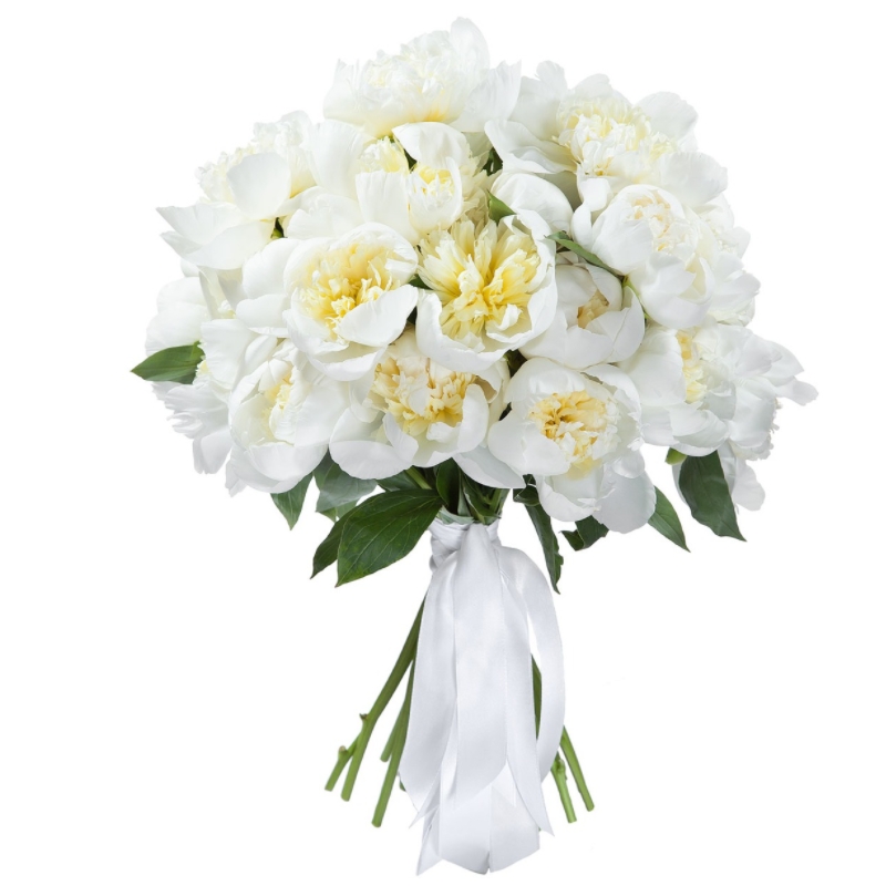 Букет состоит из 31 белый пион, прозрачная упаковка, атласная лента.